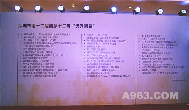 2月17日下午,第十二届创意十二月闭幕式在深圳举行,一年一度的创意盛会圆满落幕。本届创意十二月以“创意城市,创享未来”为主题,聚集了设计师和全体市民的灵动创意,开启了全城的创意能量,以创意之火点燃了一座城市的创造力。 于12月5-6日举办的国际空间设计大奖——Idea-Tops艾特奖2016年度颁奖盛典,以其专业性、国际性、权威性、公众性受到广泛认可,荣获深圳市第十二届创意十二月“优秀项目”奖。