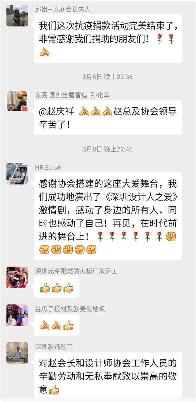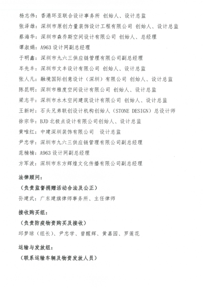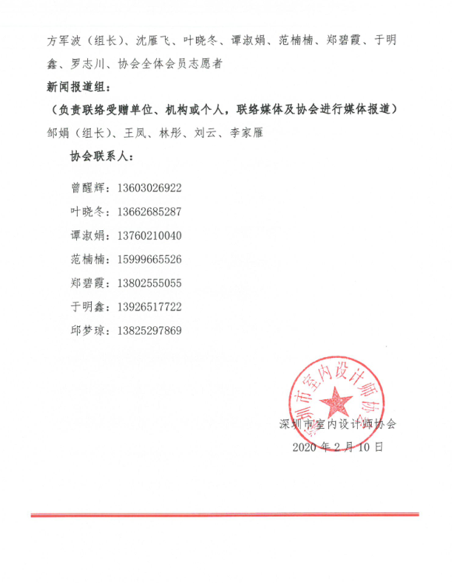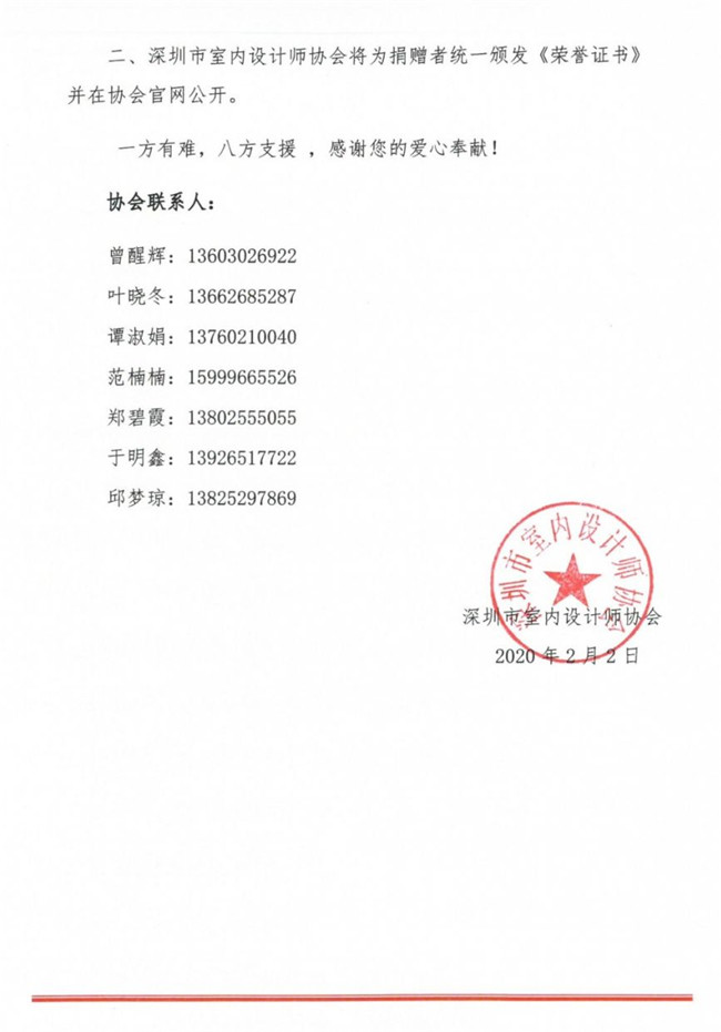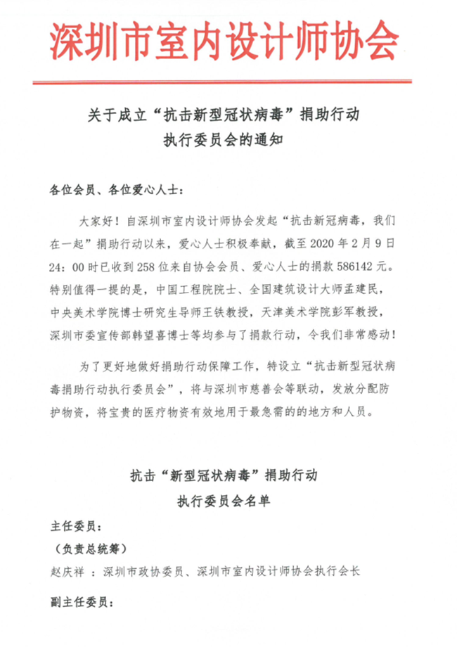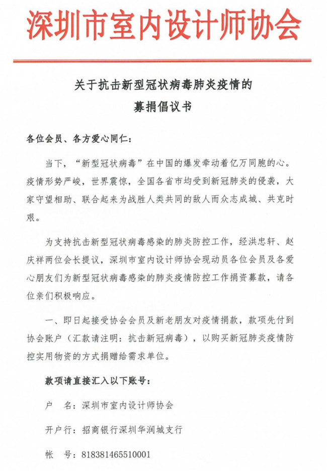 为支持抗击新冠病毒肺炎疫情防控工作,经洪忠轩、赵庆祥两位会长提议,深圳市室内设计师协会动员各位会员及爱心朋友们捐资募款。