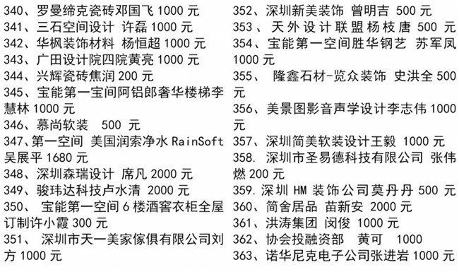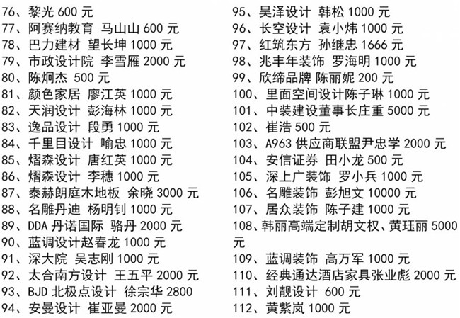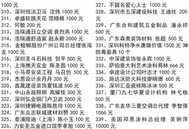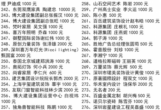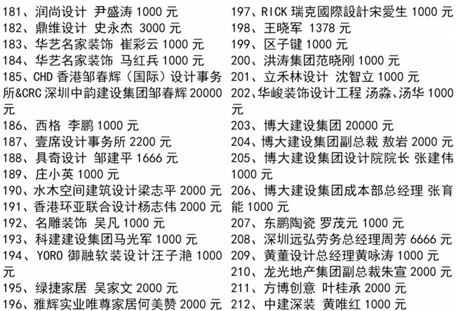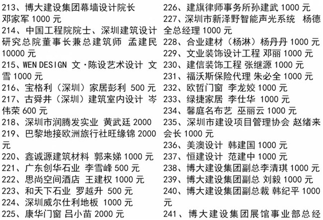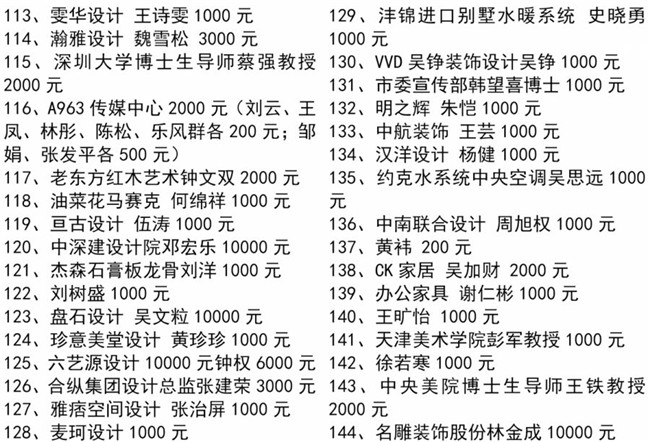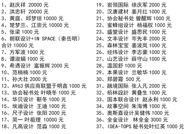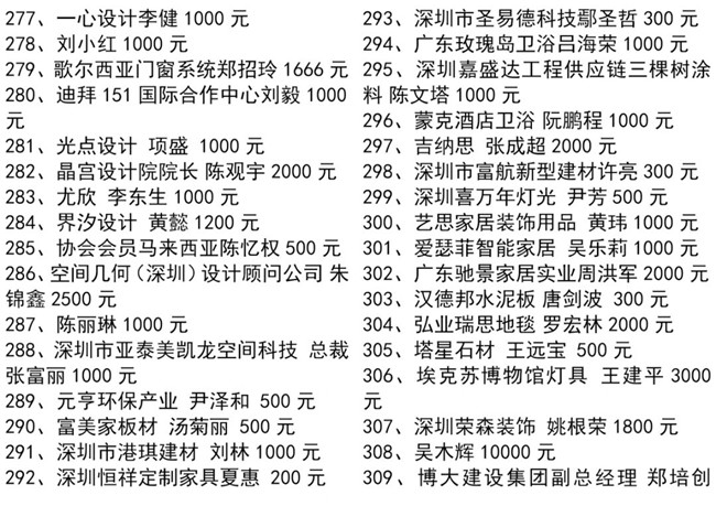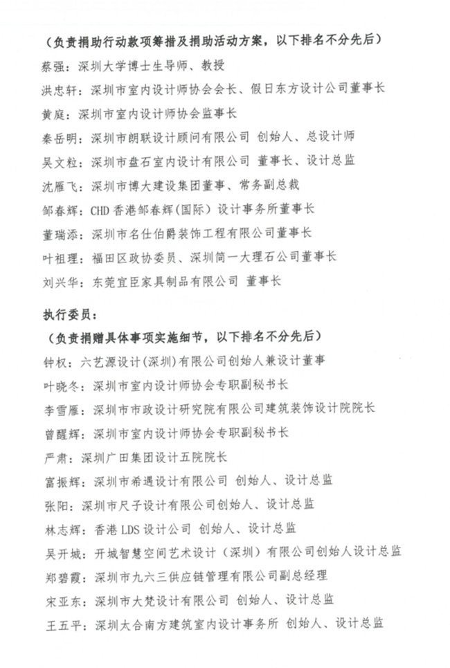 特别值得一提的是,中国工程院院士、全国建筑设计大师孟建民、中央美术学院博士研究生导师王铁教授、深圳大学博士研究生导师蔡强教授、天津美术学院彭军教授、深圳市委宣传部韩望喜博士等均参与了本次协会组织的爱心捐款行动,令大家非常感动!