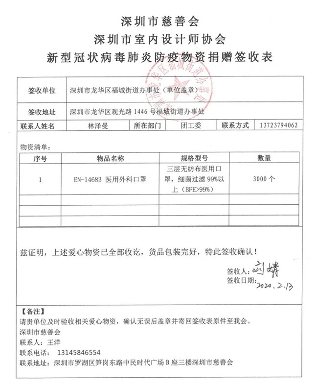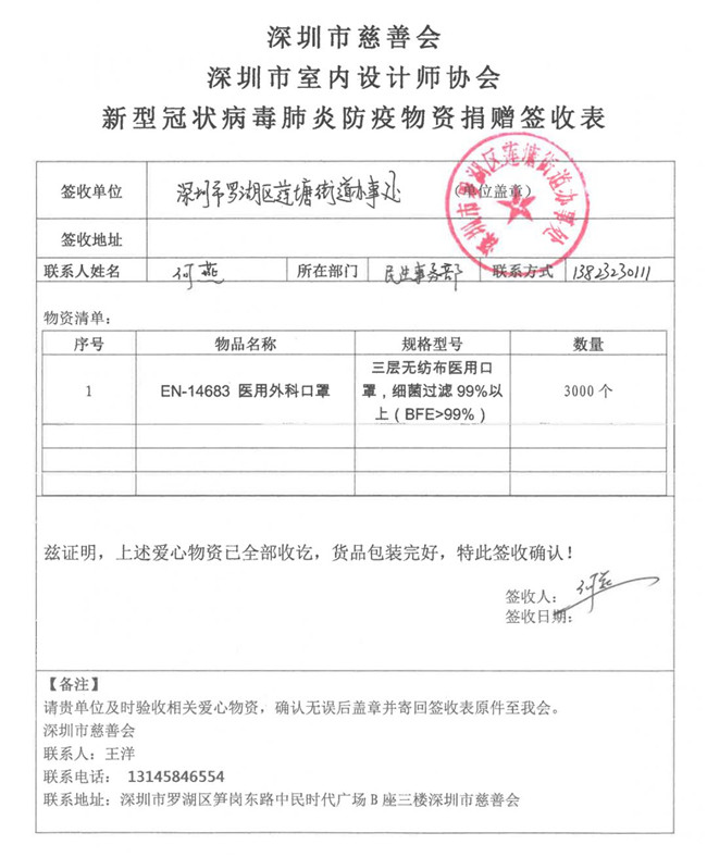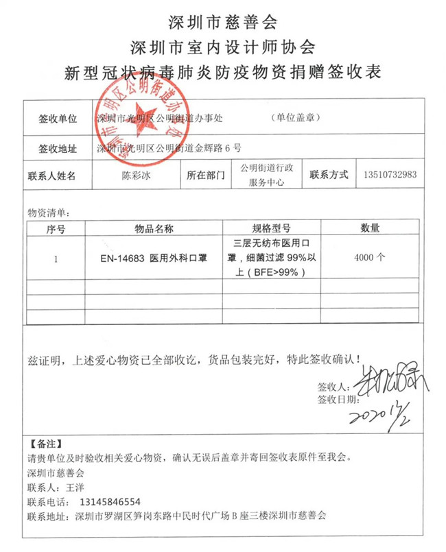 2月13日下午,深圳市政协委员、深圳市室内设计师协会执行会长赵庆祥牵头,深圳市慈善会秘书长钟声、深圳市室内设计师协会邱梦琼、广东建旗律师事务所主任律师孙建武、LDS设计创始人林志辉、文丰装饰创始人岑先丰等为代表的深圳设计界爱心人士深入走访了罗湖莲塘街道办、龙华福城街道办、光明公明街道办各社区,将第一批刚刚到达的从德国进口10000个EN-14683 医用外科口罩马上送到了连日加班加点守卫在抗疫一线的社区工作人员手中,为一线疫情防控工作加油助力。