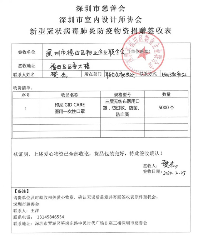 2月25日,深圳市室内设计师协会紧急调拨刚刚抵达的第五批抗疫物资5000只来自印尼的医用防护口罩,第一时间送到福田物业企业联合会,向工作在一线的物业人员表达了慰问与支持。