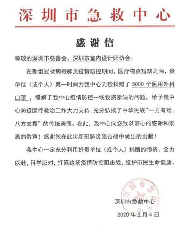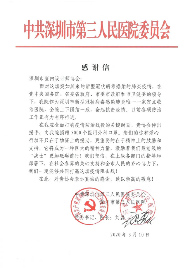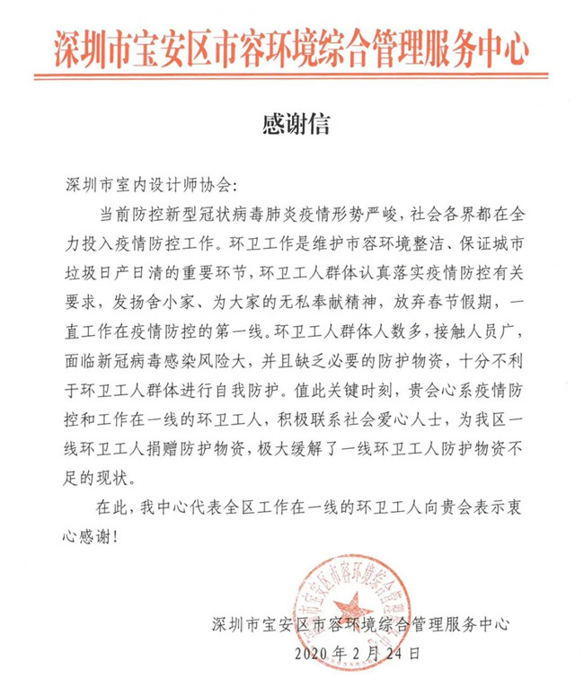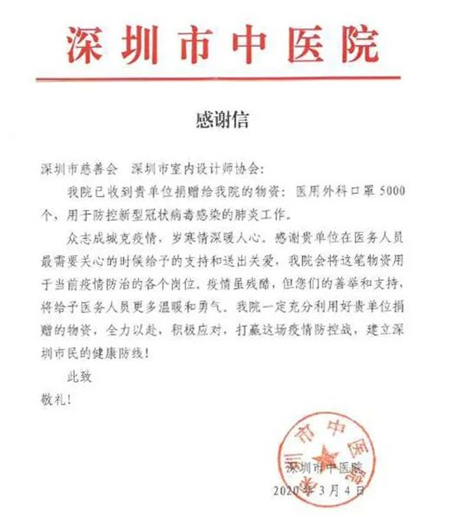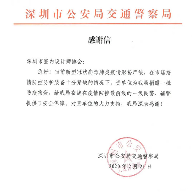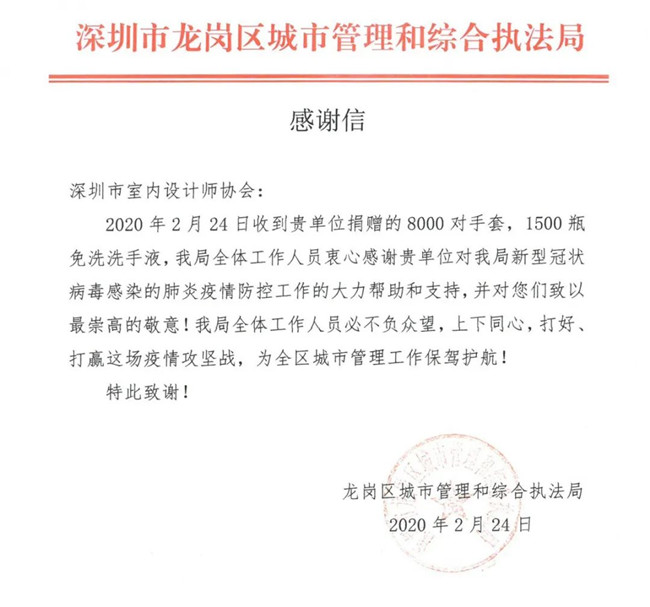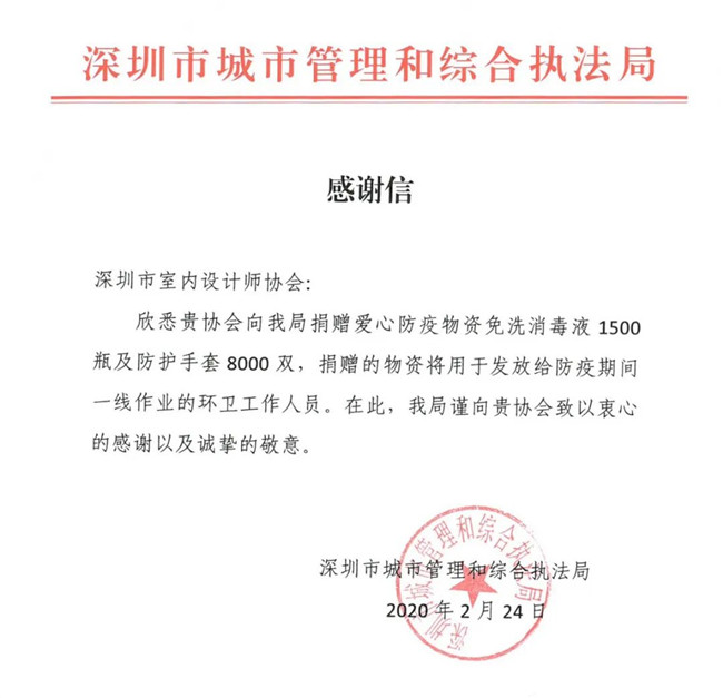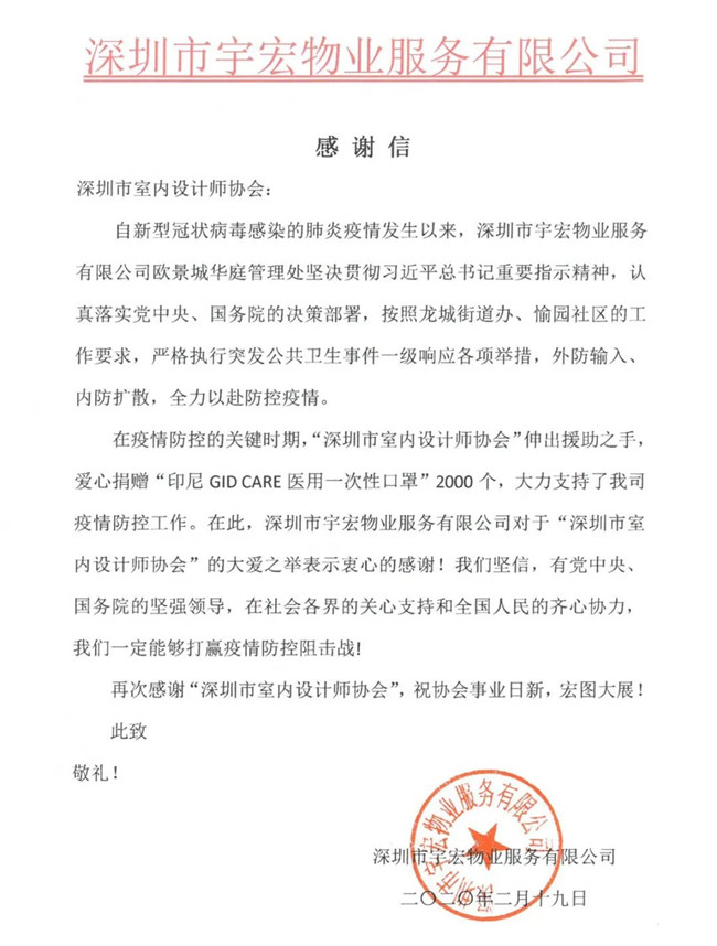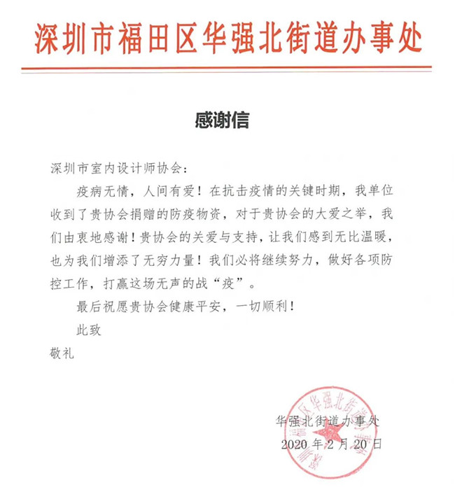 深圳市室内设计师协会此次爱心捐赠行动,有效、及时缓解了抗疫一线工作者面临的物资紧缺状况,各单位纷纷发来感谢信,对本次捐赠行动表示由衷的感谢。