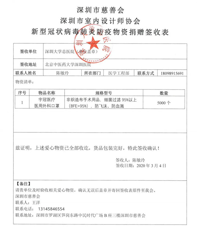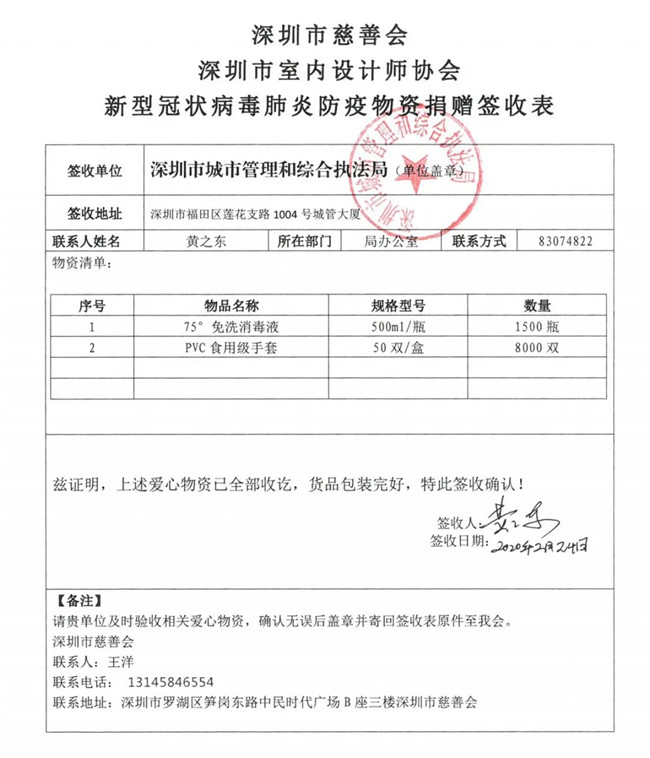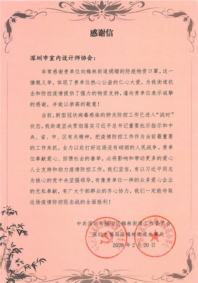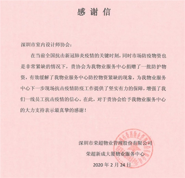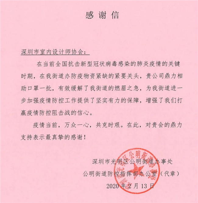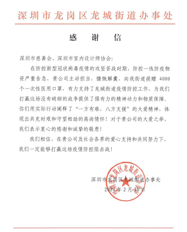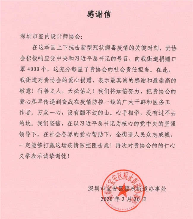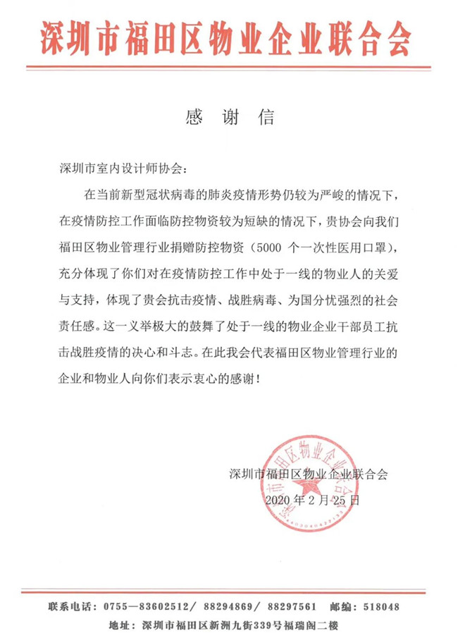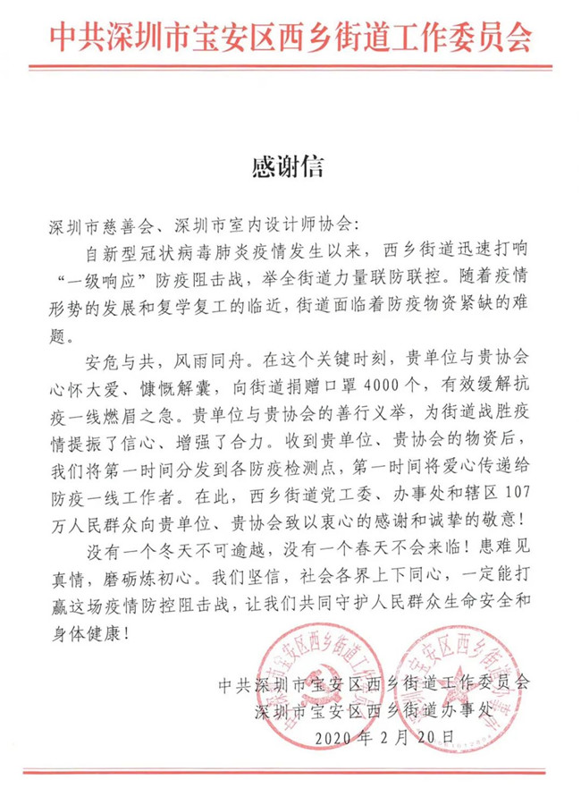 深圳市室内设计师协会此次爱心捐赠行动,有效、及时缓解了抗疫一线工作者面临的物资紧缺状况,各单位纷纷发来感谢信,对本次捐赠行动表示由衷的感谢。