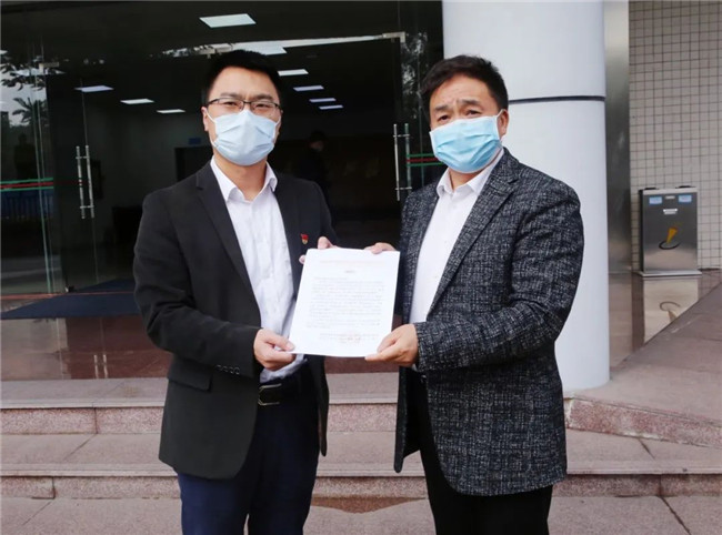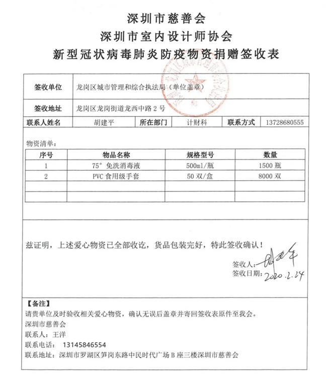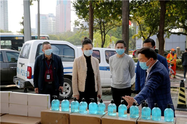 余下的500瓶免洗消毒液、1000双手套、10个3M KN90防毒面罩直接捐赠给了深圳市荣超物业管理股份有限公司,龙岗区龙城街道大运新城办主任黄宇出席见证了捐赠仪式。