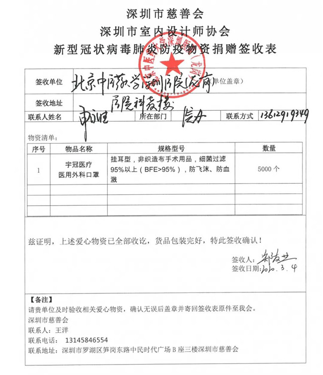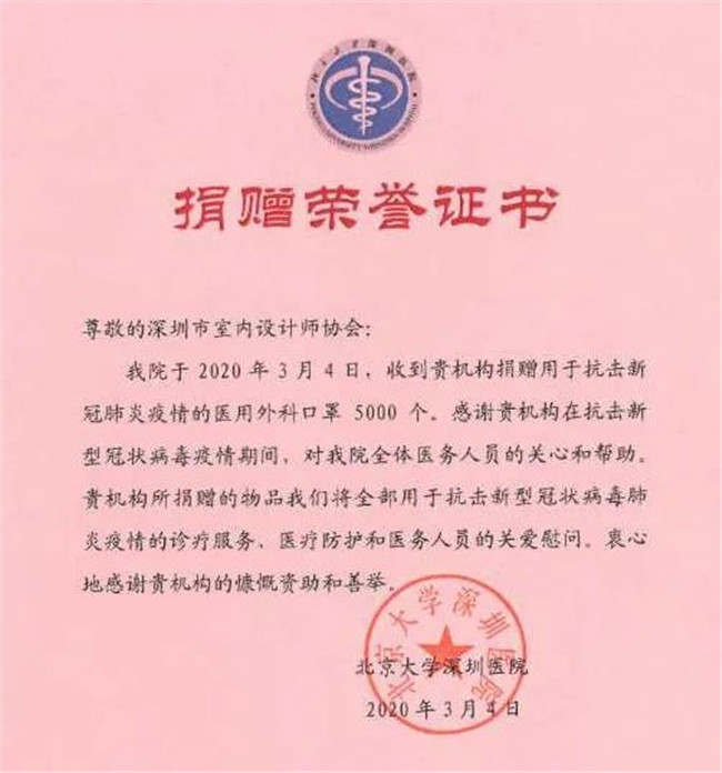 3月4日下午,深圳市室内设计师协会把经过多方努力采购到的第六批抗疫物资40000只医用外科口罩第一时间捐赠给了深圳市急救中心、深圳市人民医院、深圳市第二人民医院、深圳市第三人民医院、北京大学深圳医院、北京中医药大学深圳医院、深圳市中医院、深圳大学总医院等8家疫情重点筛查治疗医疗单位,对一线医护人员表达了慰问与支持。