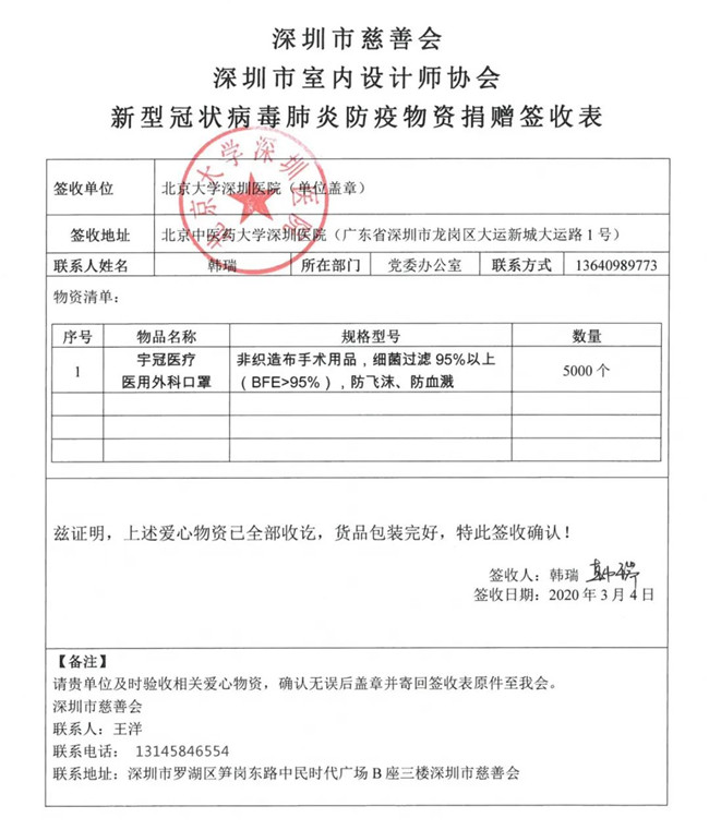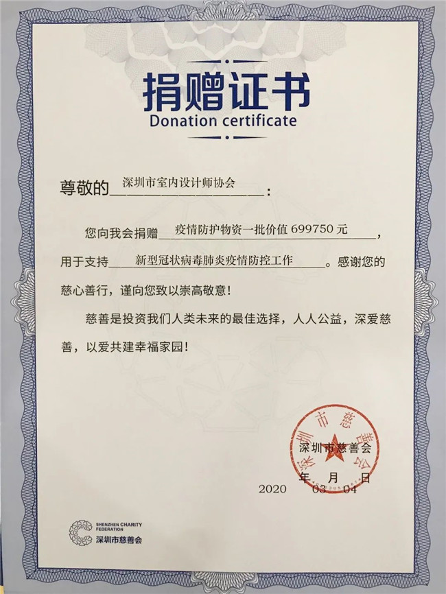 黄鹤风雨,神州共赴!自2月2日,深圳市室内设计师协会发起“抗击新冠病毒 ,我们在一起”捐赠行动以来,共收到363位协会会员及爱心人士捐款702920元。先后从国内外采购6批抗疫物资,包括88000只医用防护口罩、5000瓶免洗消毒液、25000双防护手套等,价值699750元。所有抗疫物资均通过深圳市慈善会向防疫一线的医护人员、社区人员、物业、交警、新闻记者、环卫工等捐出。在本次行动中,深圳市室内设计师协会全体同仁用实际行动,用”爱心、责任和担当”赢得了社会各界的尊敬和广泛赞誉!我们的这段短暂而光荣的经历,必将载入深圳人抗击新冠病毒这场世纪之疫的历史!