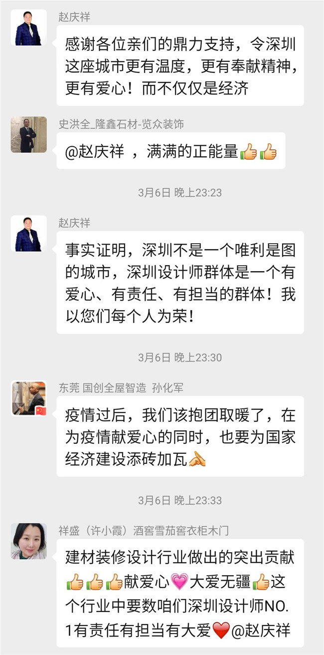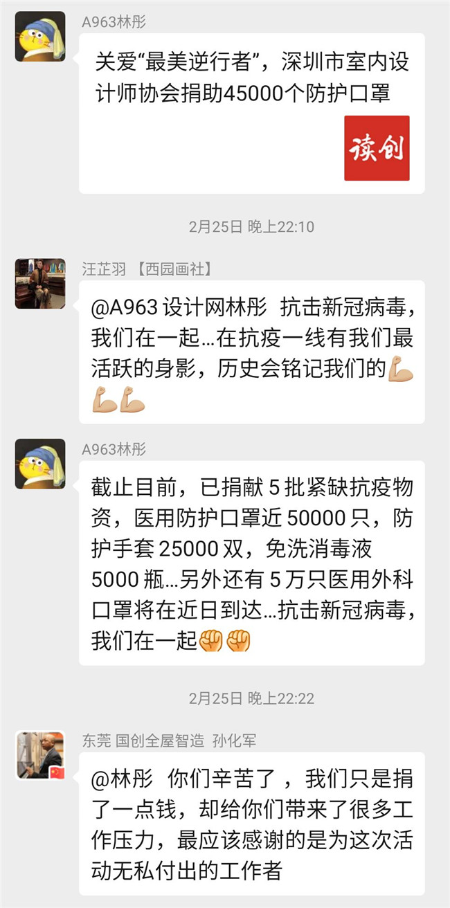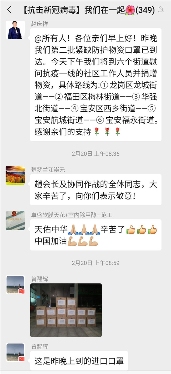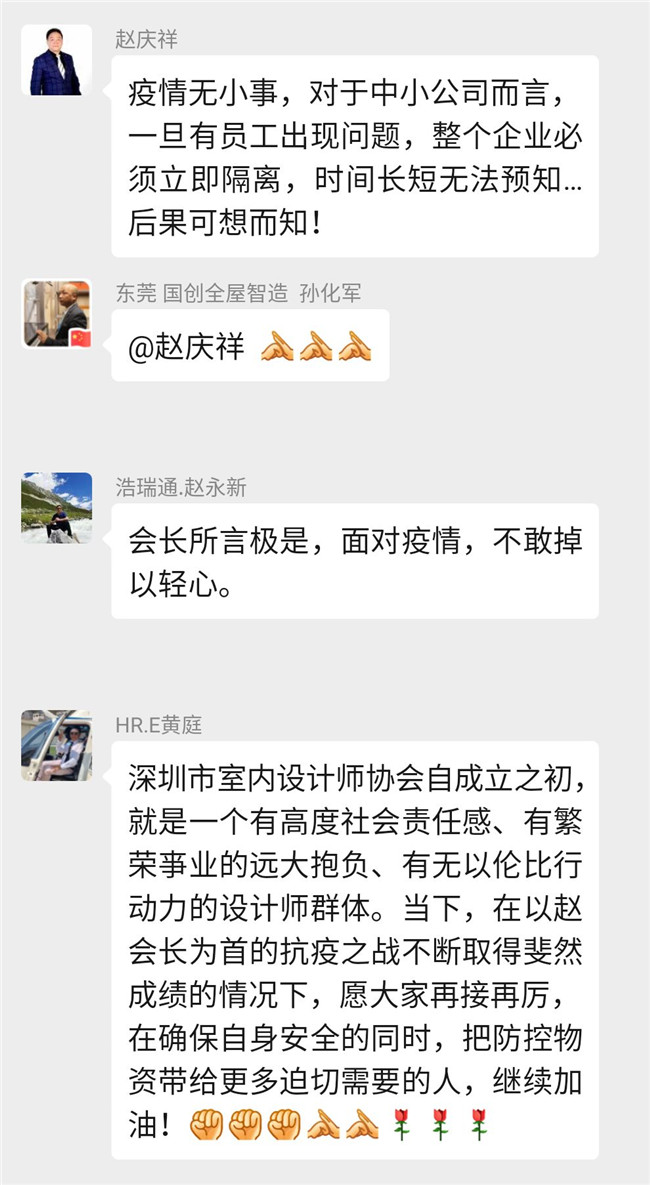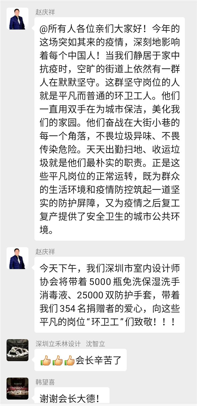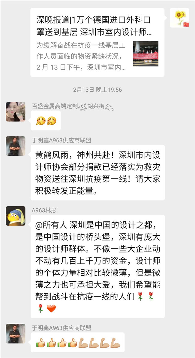自疫情发生以来,深圳市室内设计师协会持续关注着疫情的发展,赵庆祥会长亲自组建了”抗击新冠病毒,我们在一起”爱心捐赠微信群,号召行业爱心人士捐资出力,开辟各种渠道购买防护物资,及时为一线抗疫人员送去所需物资。