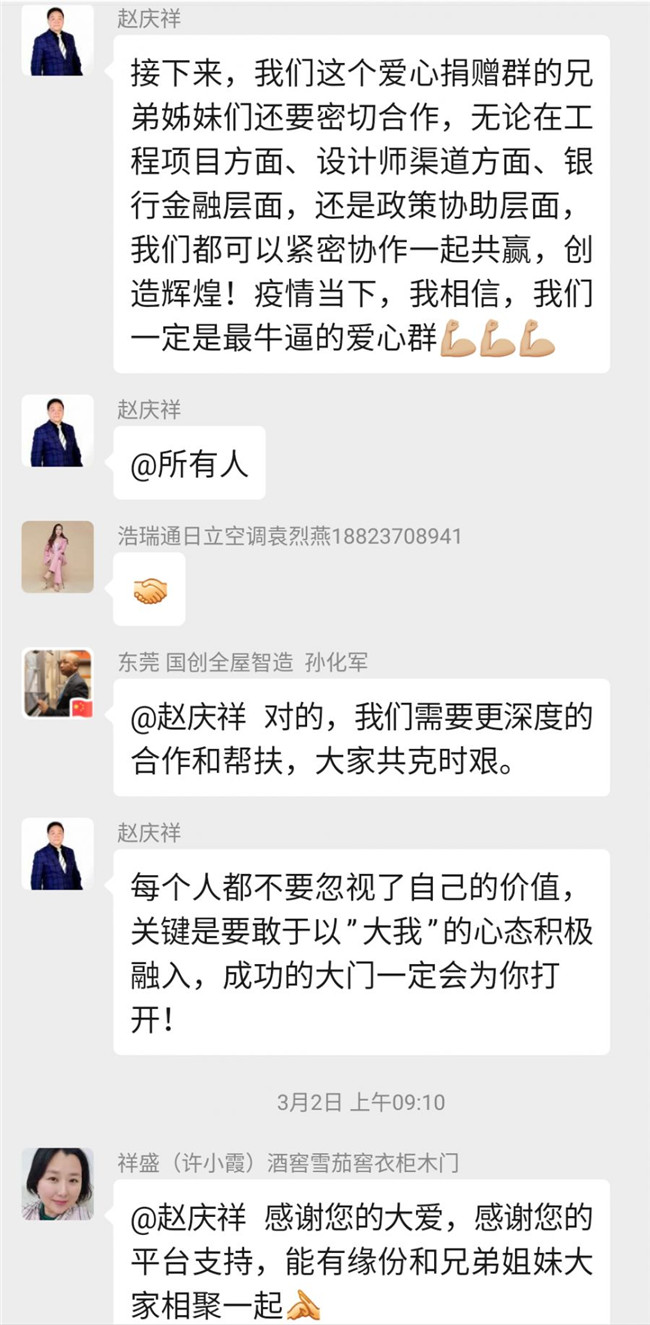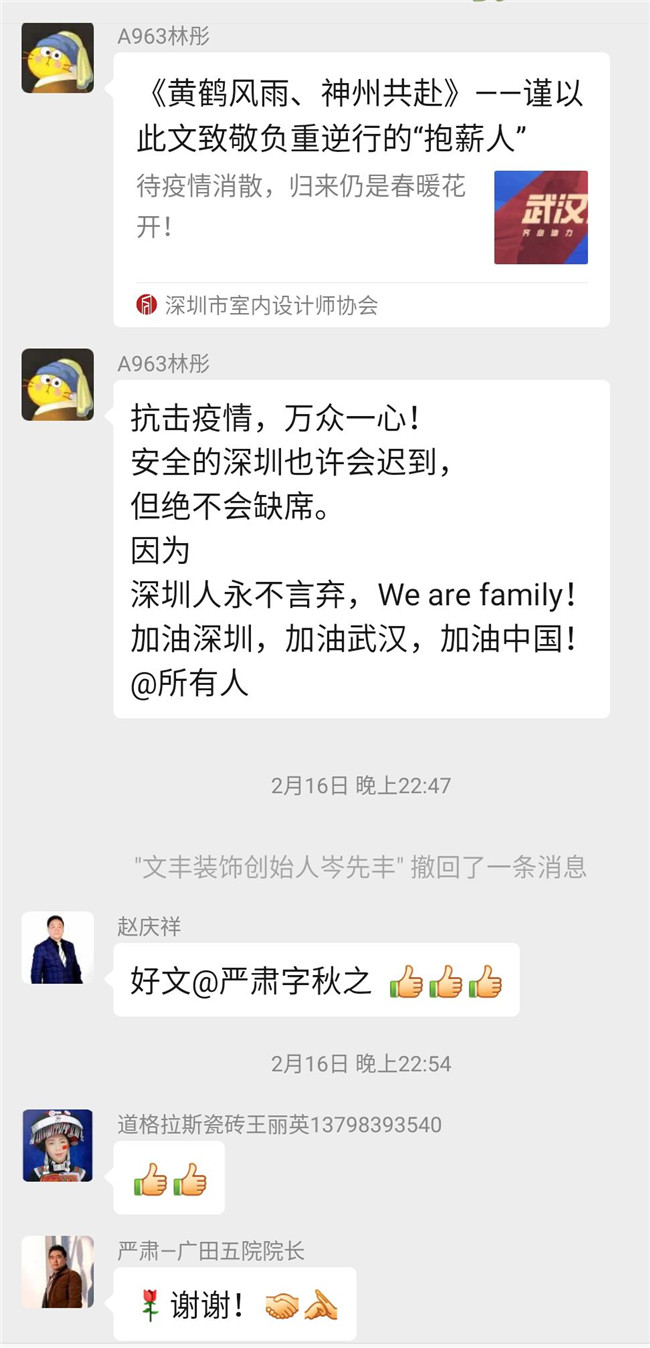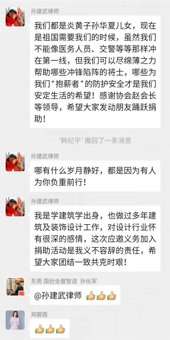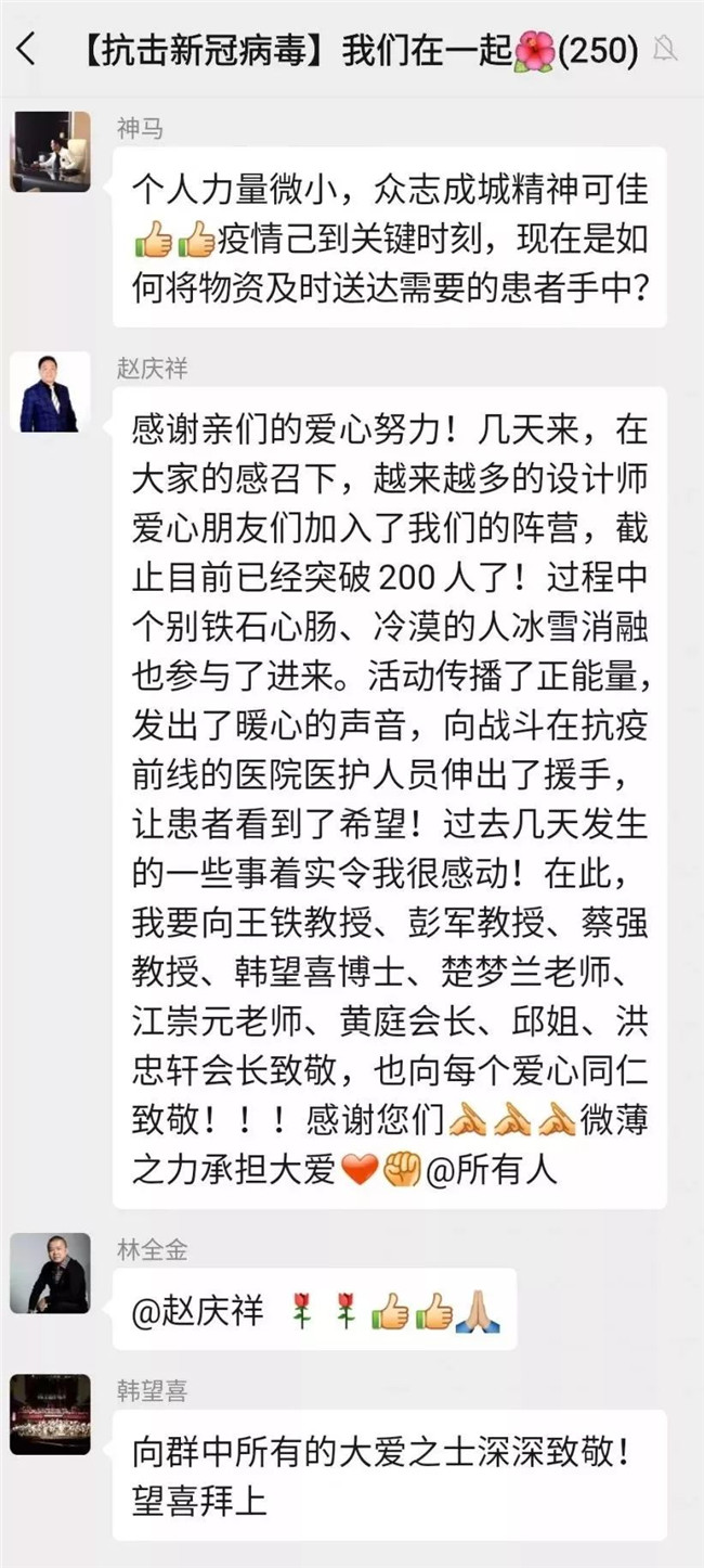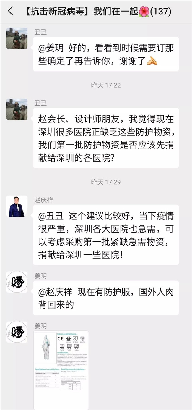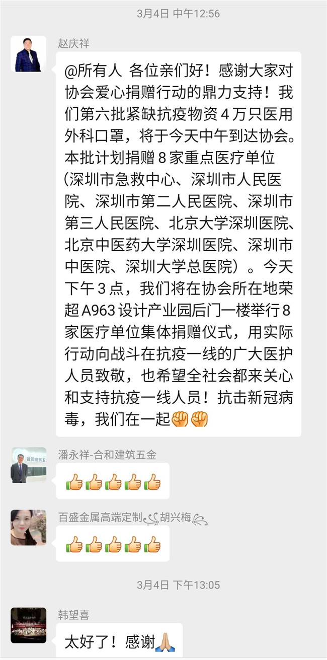 自疫情发生以来,深圳市室内设计师协会持续关注着疫情的发展,赵庆祥会长亲自组建了”抗击新冠病毒,我们在一起”爱心捐赠微信群,号召行业爱心人士捐资出力,开辟各种渠道购买防护物资,及时为一线抗疫人员送去所需物资。
