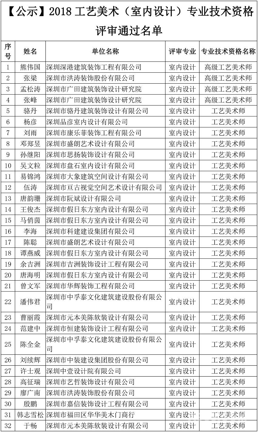 经2018工艺美术(室内设计)专业技术资格评审委员会评审,下列同志分别获得了相应级别的专业技术资格,现予公示。公示时间从2018年 12月 24日8:00至2018 年 12月 31日18:00(共七日)。若下列同志取得资格有异议,请电话或书面向深圳市工艺美术(室内设计)专业技术资格评审委员会办公室或深圳市职称管理部门反映,反映情况的电话和书面材料要自报或签署真实姓名,不报或不签署真实姓名的,一律不予受理。