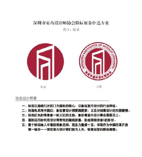 深圳市室内设计师协会面向全社会征求协会标志、会徽设计方案的活动,反响热烈。活动共收到382个应征方案。经过深圳市室内设计师协会徽标评审专家小组及协会顾问、著名平面设计艺术家陈绍华先生的评选,来自安徽的徐斌设计的方案被最终中选。另外,郑小乐等8位设计师提供的设计方案为入围方案。终选方案采用中国红为标准色,象征设计师们爱国爱家的热情,以连续打开的门为图形核心,象征室内设计的行业特征。整个标志给人丰富的想象空间,而且力量感十足,体现了作为中国改革开放第一城市,深圳室内设计师们感为先、锐意进取的群体面貌。中选方案经深圳市室内设计师协会首届理事会第一次理事(扩大)会议讨论,已获通过,被确定为深圳市室内设计师协会标志、会徽。